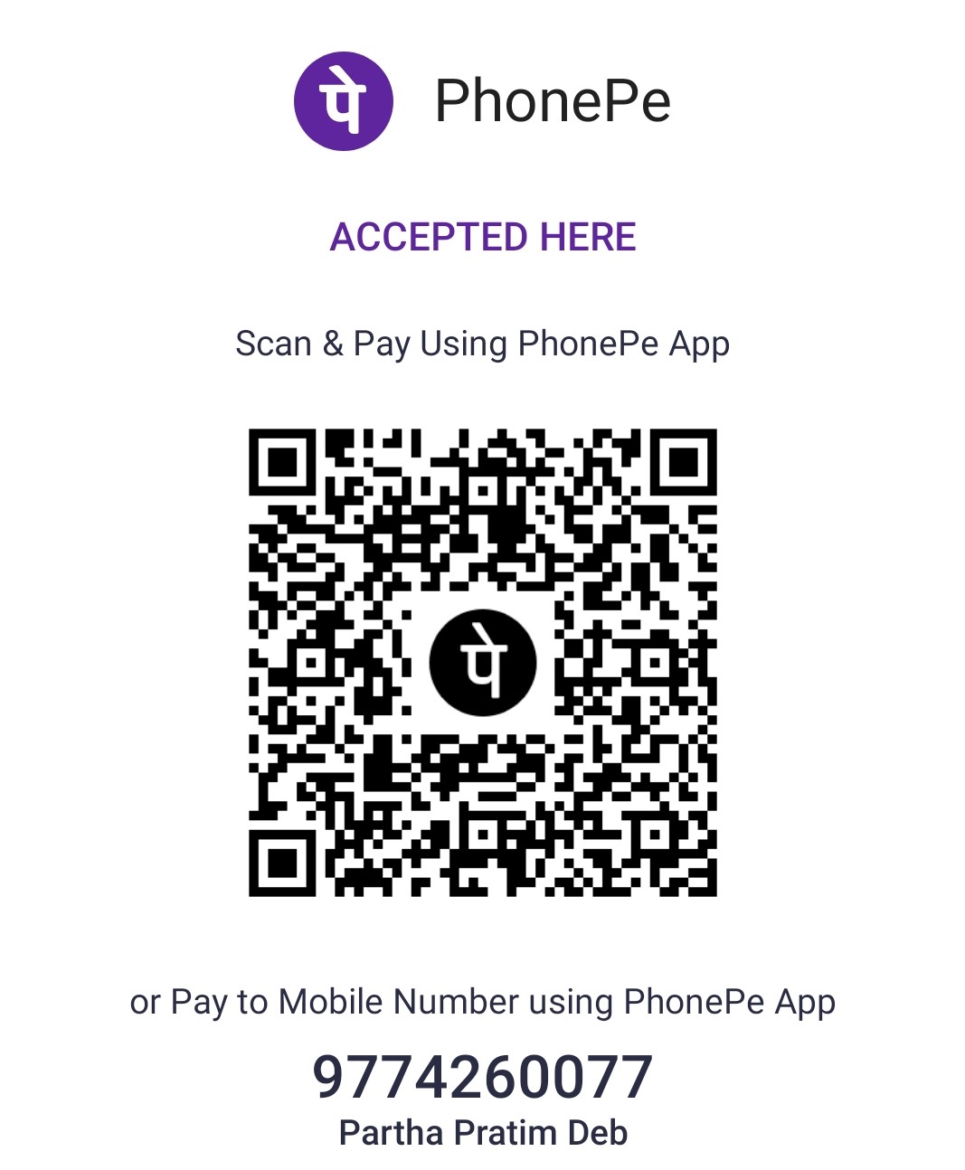 Phone Pe BHIM UPI: 9774260077@ybl